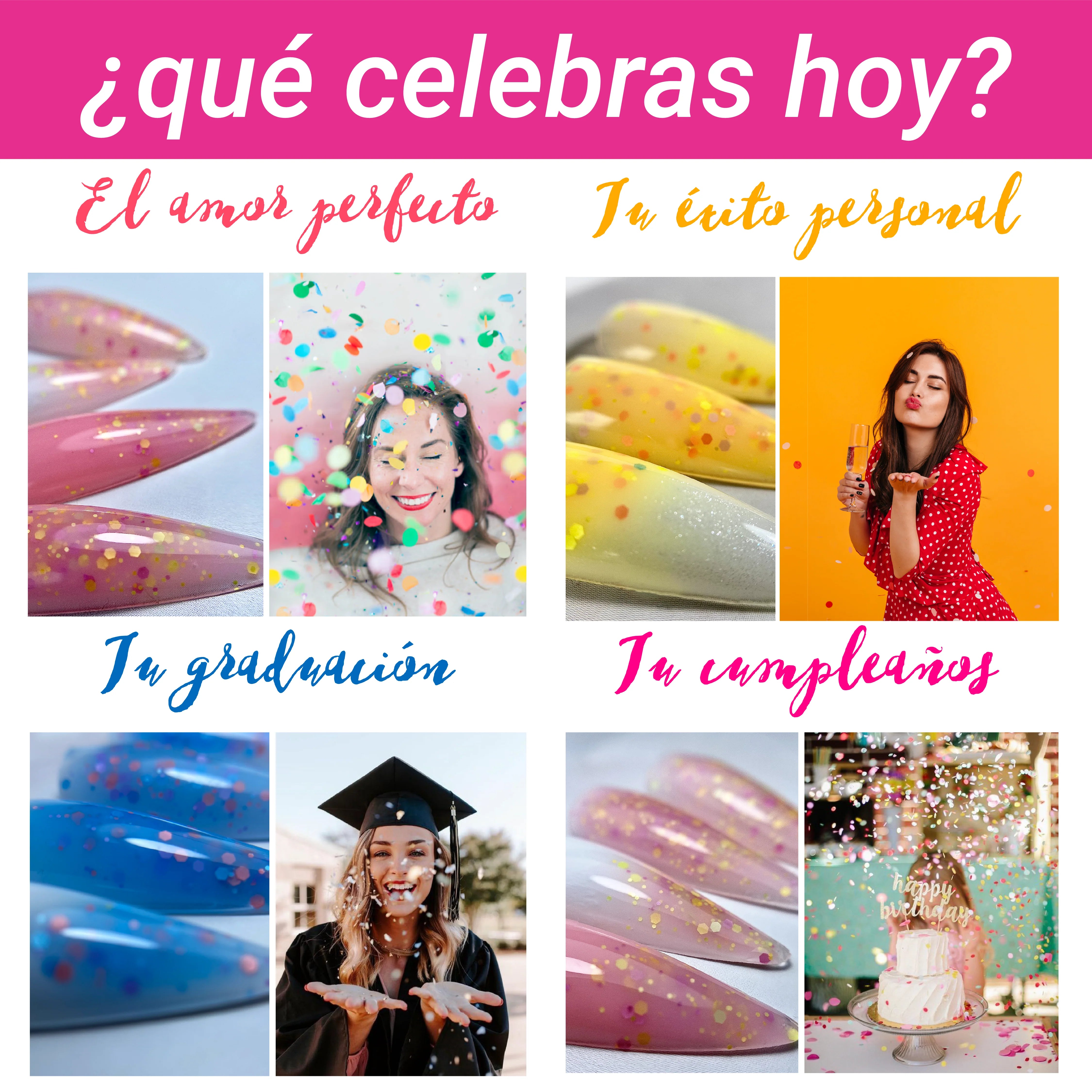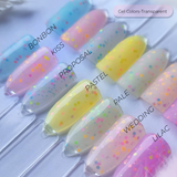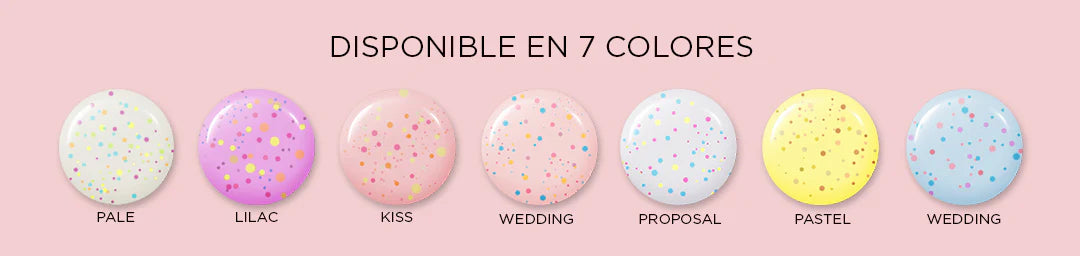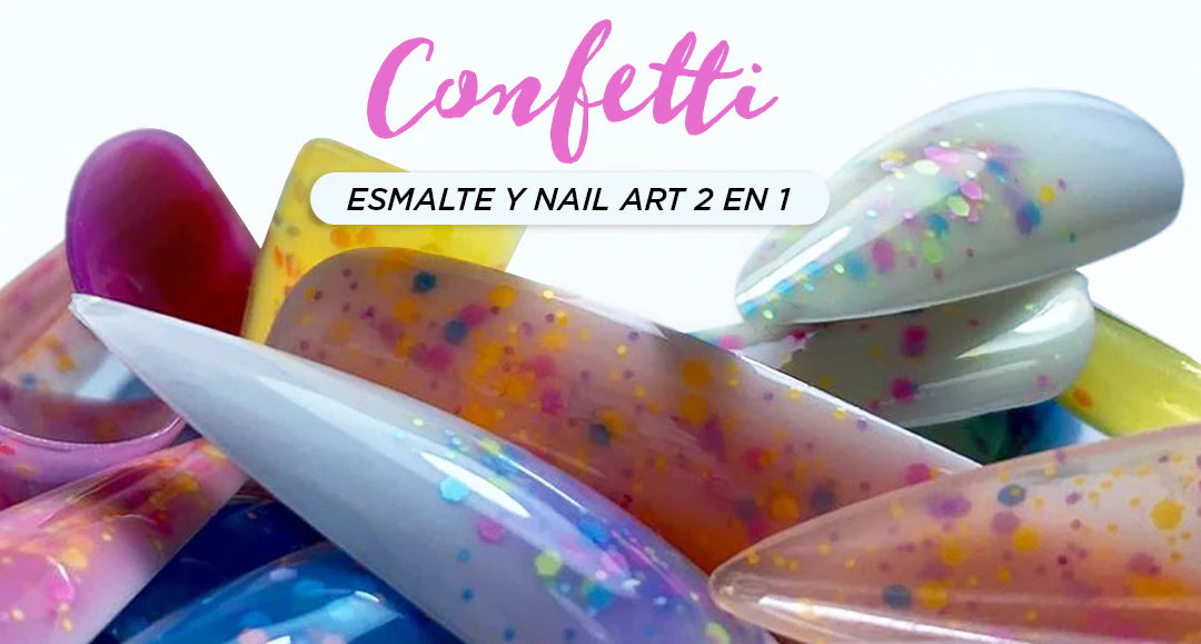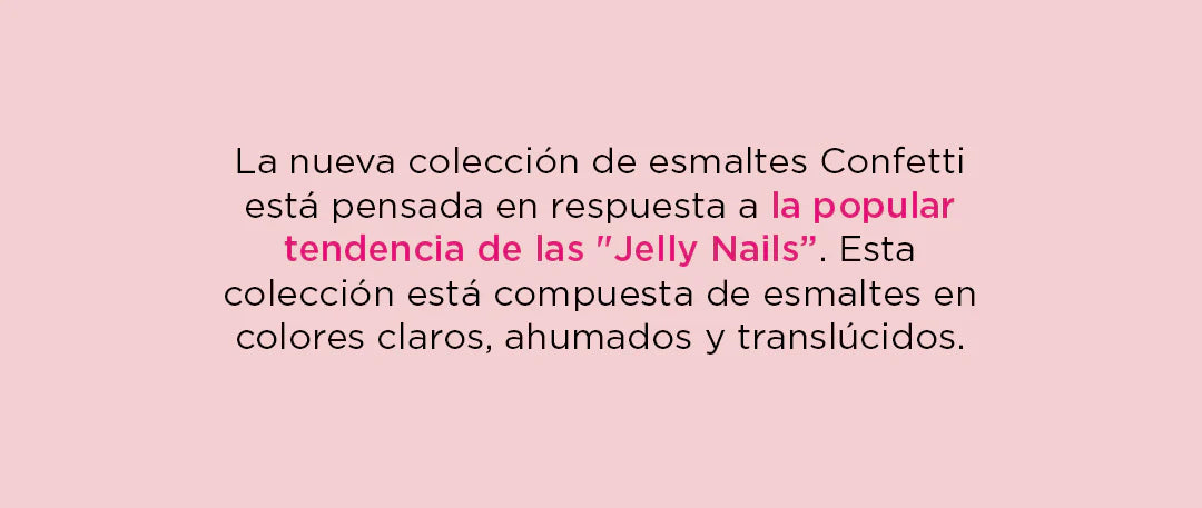 La nueva colección de esmaltes Confetti está pensada en respuesta a la popular tendencia de las "Jelly Nails”. Esta colección está compuesta de esmaltes en colores claros, ahumados y translúcidos.