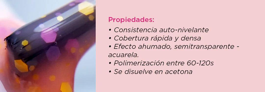Atención: Estos colores son transparentes. En algunas fotos de manicura se puede ver una combinación de diferentes productos, por lo que el resultado final puede parecer diferente. Le recomendamos que elija los colores basándose en la paleta de colores de la imagen.