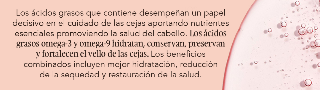 Los ácidos grasos de estos componentes desempeñan un papel clave en el cuidado de las cejas, ya que aportan nutrientes esenciales y favorecen la salud general del vello. Los ácidos grasos omega-3 y omega-9 contribuyen a la hidratación, la retención de la humedad y el fortalecimiento del vello de las cejas. Los beneficios combinados incluyen una mayor elasticidad, una reducción de la sequedad y un aspecto brillante y revitalizado, por lo que son esenciales para mantener unas cejas sanas y nutridas.