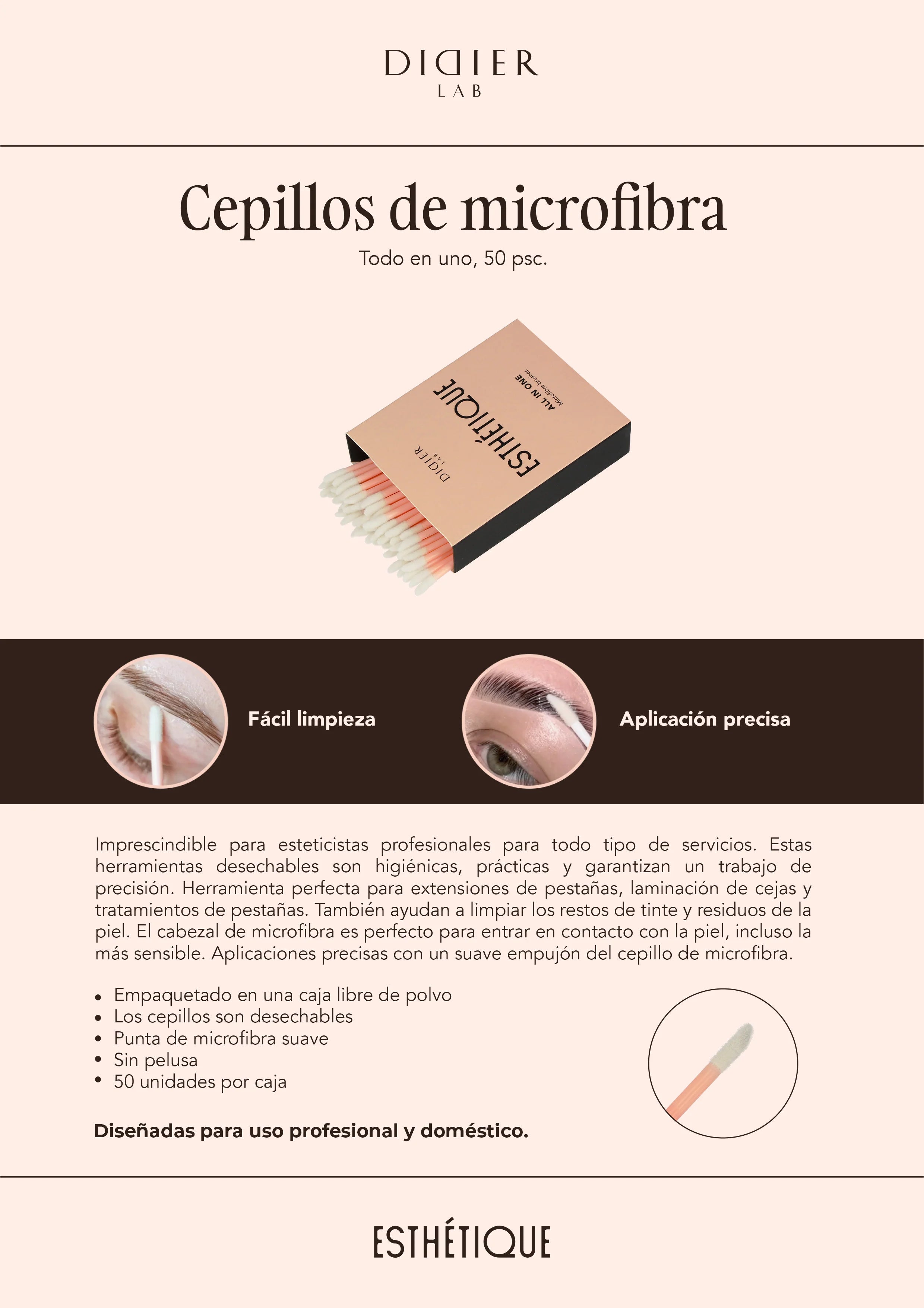 Una herramienta indispensable para esteticistas profesionales para todo tipo de servicios. Estas herramientas desechables son higiénicas, prácticas y garantizan un trabajo de precisión. Perfecto para extensiones de pestañas, realce de cejas y tratamientos de pestañas. También limpian la piel de restos de tinte y otros residuos. El cabezal de microfibra es ideal para el contacto incluso con pieles sensibles. Aplicaciones precisas con el suave empuje del cepillo de microfibra.