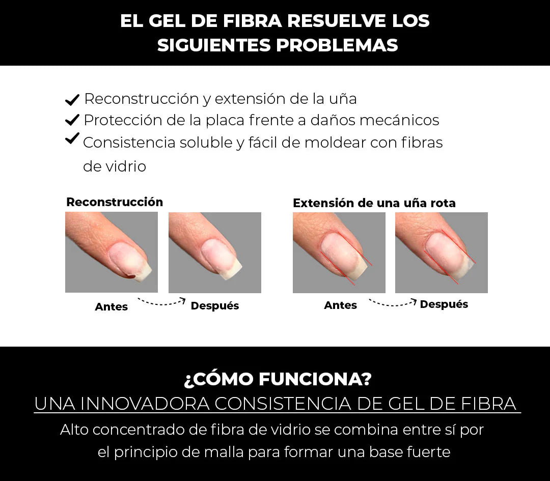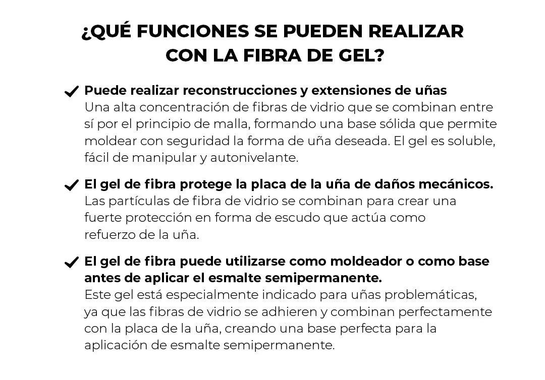 Fiber Glass Gel contiene una alta concentración de partículas de fibra de vidrio que crean una base de tela de araña extremadamente fuerte para uñas muy débiles, flexibles y rotas. La fórmula garantiza una adhesión óptima a las uñas problemáticas, lo que permite crear extensiones de manicura y pedicura.