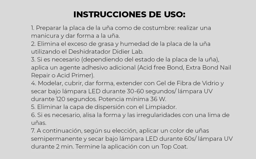 4. Modelar, cubrir, dar forma, extender con Gel de Fibra de Vidrio y secar bajo lámpara LED durante 30-60 segundos/ lámpara UV durante 120 segundos. Potencia mínima 36 W.