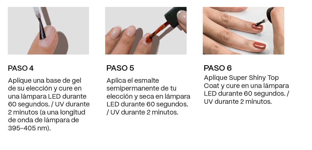 6. Aplicar el Super Shiny Top Coat y catalizar bajo una lámpara LED 60s / UV 2min.