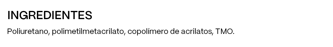 Ingredientes : POLIURETANO, POLIMETIL, METACRILATO, ACRILATOS, COPOLIMERO, TMO.