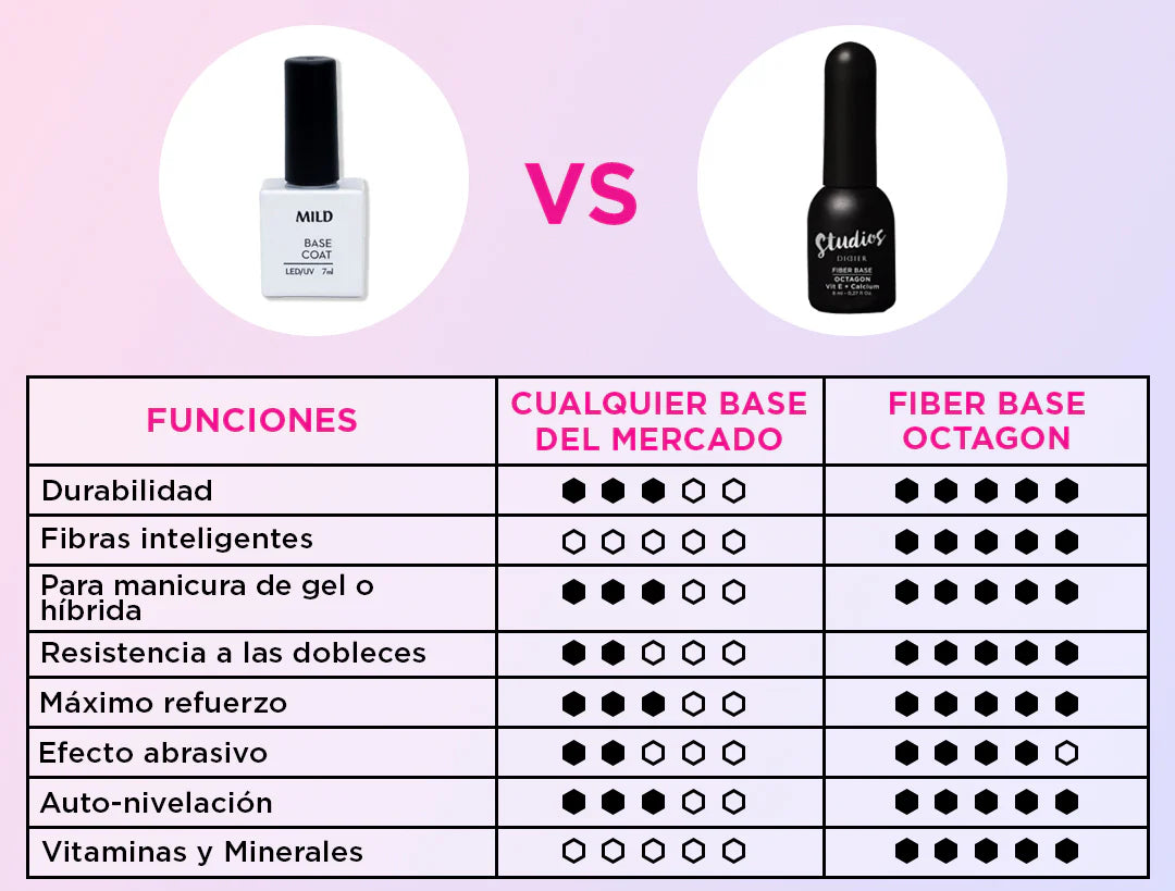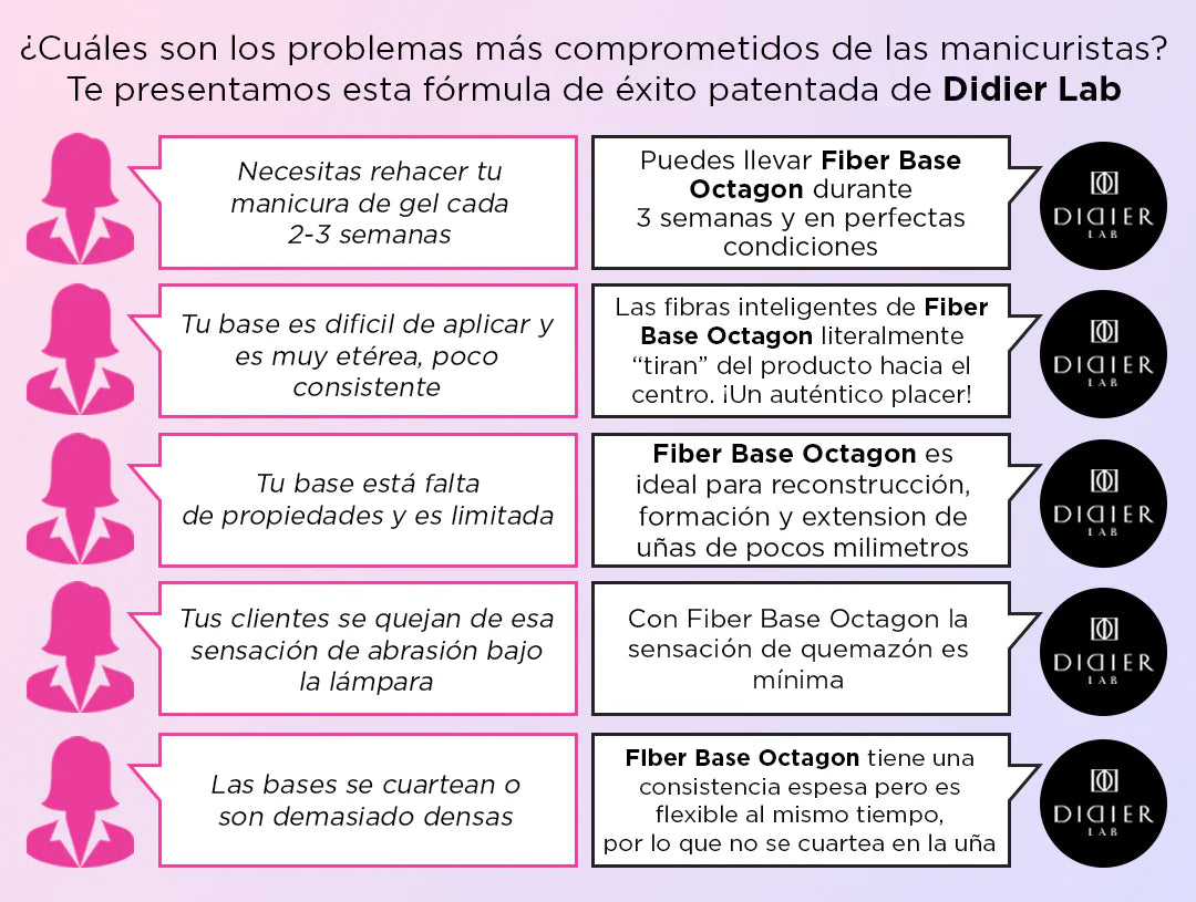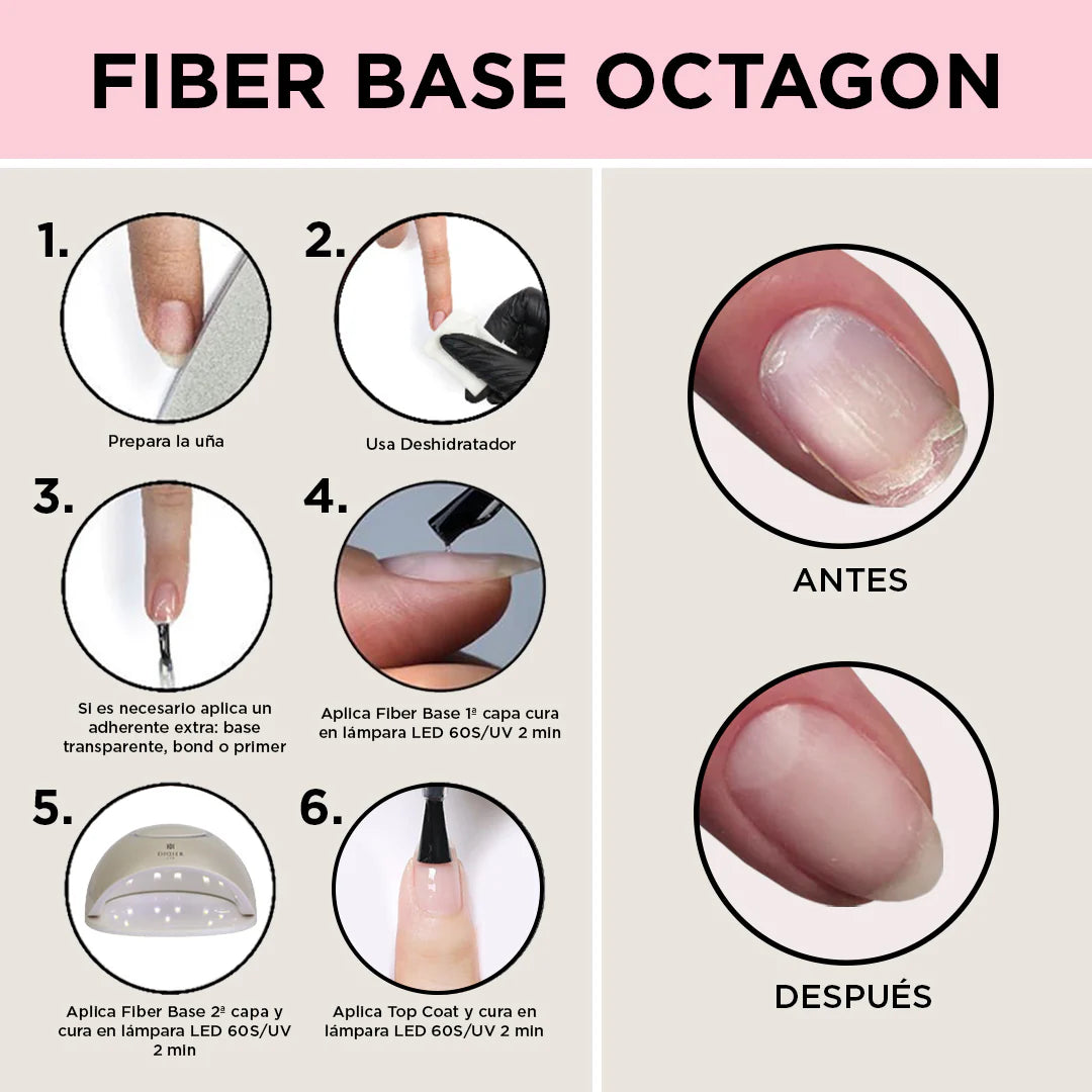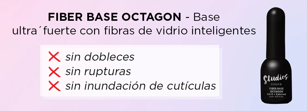 La fórmula de Fiber Base Octagon Studios Didier es rica en vitamina E y calcio , así como en fibras sintéticas de vidrio y nylon, libre de HEMA y TPO. Se ha creado para responder a las demandas y retos más comunes, como: