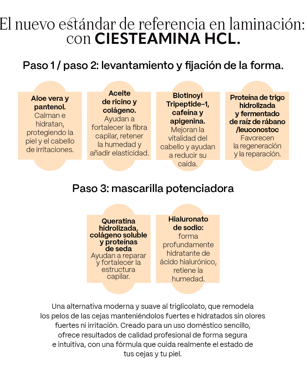 El nuevo estándar de oro en laminado: Cisteamina HCL. Una alternativa moderna y suave al tioglicolato que remodela el vello de las cejas mientras lo mantiene fuerte, suave e hidratado, sin olor fuerte ni irritación. Diseñado para un uso sencillo en casa, ofrece resultados de calidad profesional de forma segura, intuitiva y con una fórmula que realmente cuida la condición de tus cejas y tu piel.